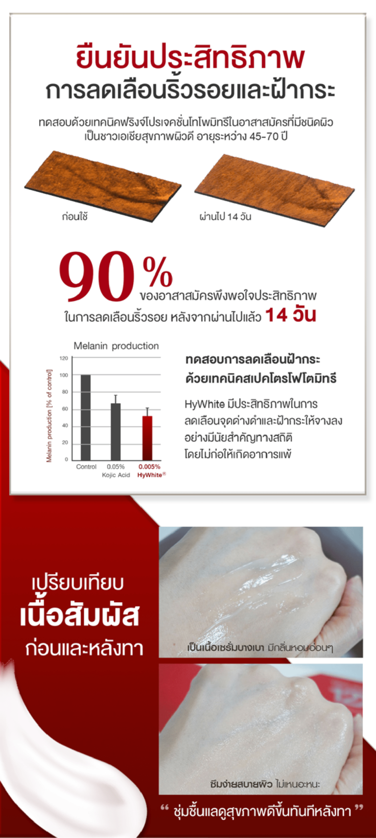 - ยืนยันประสิทธิภาพ การลดเลือนริ้วรอยและฝ้ากระ